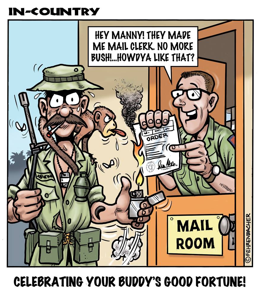 Phil enlisted in the Army in 1965 where he served for years in Vietnam.  He became a graphic designer and has worked for the state of Oregon for 26 years.  He retired in 2003 and started the Cartoon "In-Country".  The cartoons reflect his experiences during his tour of duty in South Vietnam.